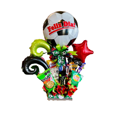 ¿Buscas un detalle especial que combine pasión por el fútbol y deliciosos antojos? Este arreglo de globos de fútbol, acompañado de dulces chocolates, papas crujientes, cacahuates y un elegante moño, es la elección ideal. Perfecto para cumpleaños, celebraciones deportivas o simplemente para sorprender a ese fanático del fútbol que tanto quieres.