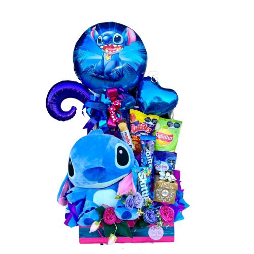 Este increíble arreglo incluye globos temáticos decorados con el estilo vibrante de Stitch, un adorable peluche de Stitch que se convierte en el compañero ideal, además de una deliciosa selección de dulces y chocolates. Cada elemento ha sido cuidadosamente elegido para ofrecer una experiencia completa y memorable. Tanto los globos como el peluche tienen un diseño atractivo y detallado, mientras que los dulces y chocolates añaden un toque irresistible.