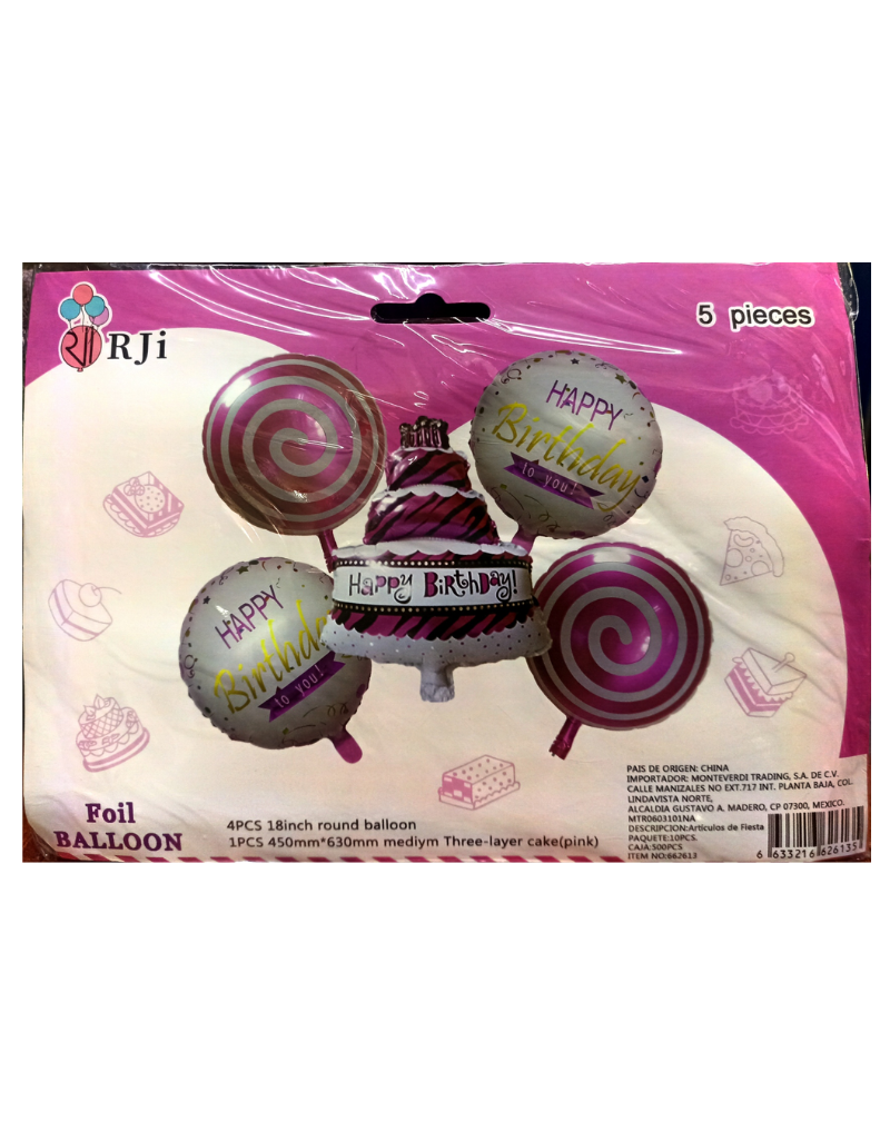 Este set incluye 5 globos metálicos con diseños coloridos de pasteles, ideales para darle un toque festivo y delicioso a cualquier evento.